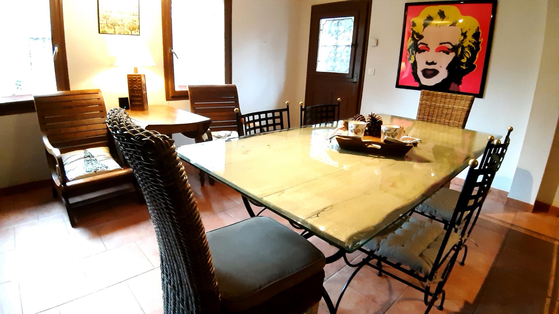 La salle à manger s'ouvre sur le sous-bois, dans les pins..../dining room facing the pineforest